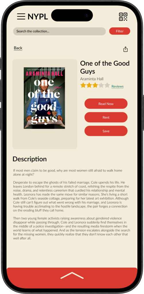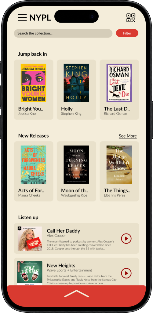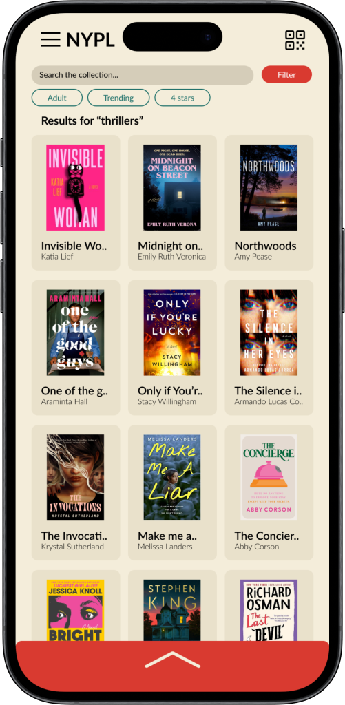 Once the features got carved out, the next step was taking the iconic red and white branding of the NYPL and transform it into something more modern without losing those functions. I experimented with the two aesthetics shown below; the first rendition of the design being the gradient red. With so many red components, I found it difficult to display any type of visual hierarchy. I changed the design to a warm cream color - like the pages of a book - to increase legibility and the use of red for visual hierarchy instead.
