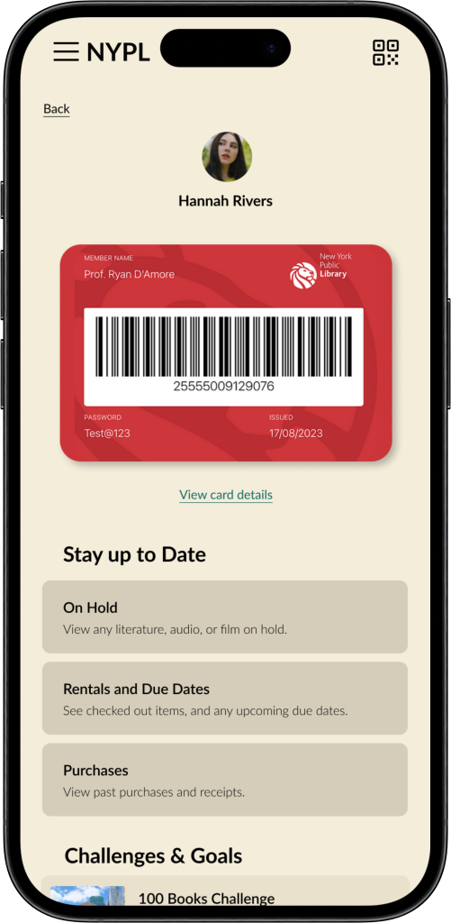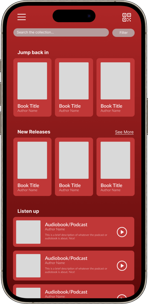 The homepage has quick links to personalized suggestions, recent reads, and suggested audios, serving as the users personally curated bookshelf. A hamburger menu on the top left opens a menu that allows the user to view their saved content organized in collections of their design. The QR code on the top right gives the user access to their library card and account information.