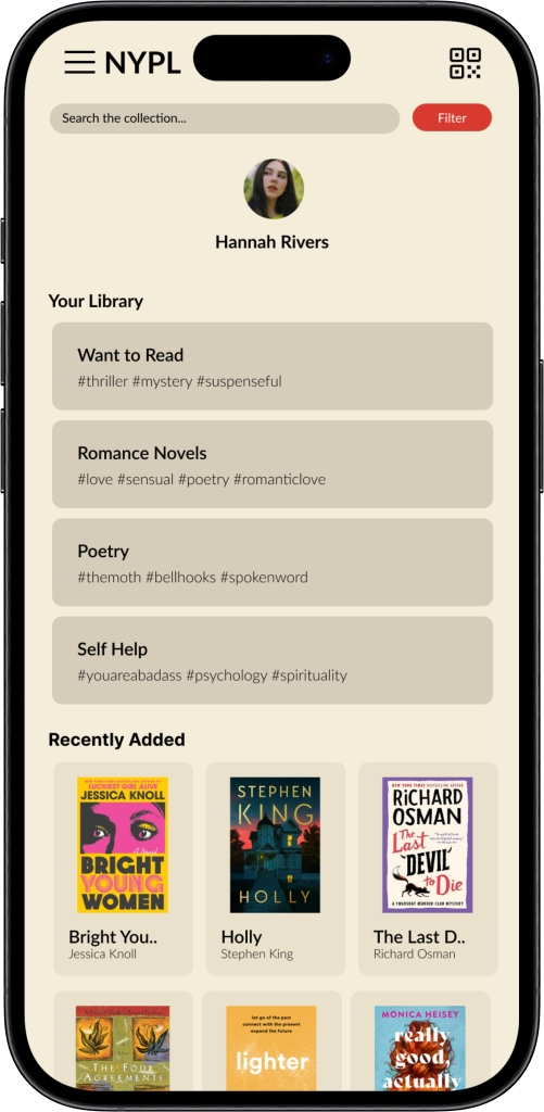 Using a prompt generated by Google’s Gemini to mimic working for a client, I was tasked to redesign the NYPL app with the goals of improved navigation, personalized recommendations, and features to engage younger audiences. This project lasted 8 weeks, from conducting user research to high fidelity prototypes.