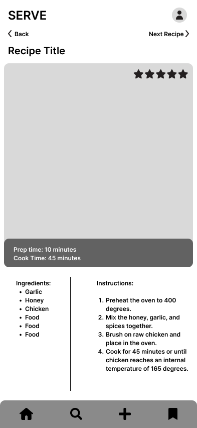 When searching for recipes, it is not uncommon to come across a long winded blog post or an onslaught of advertisements before the actual recipe. In a society where our time is more valuable than ever, this can be extremely frustrating to users, and even cause them to abandon the recipe all together, hurting both the creator and the consumer. SERVE is a week long exploration dedicated to finding a better way to get recipes to users without losing personalization or advertisement revenue.