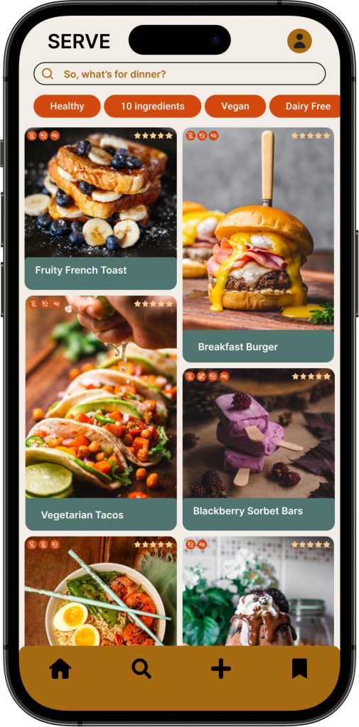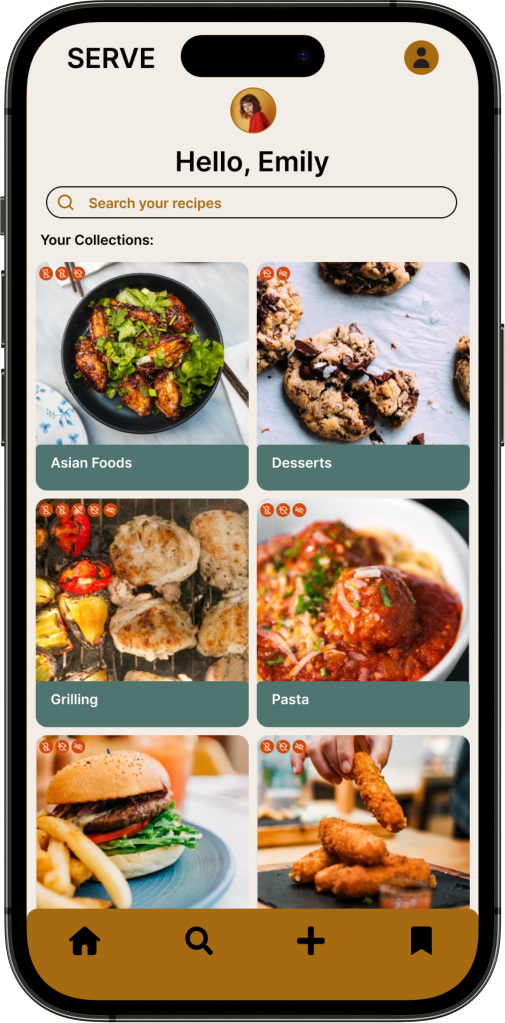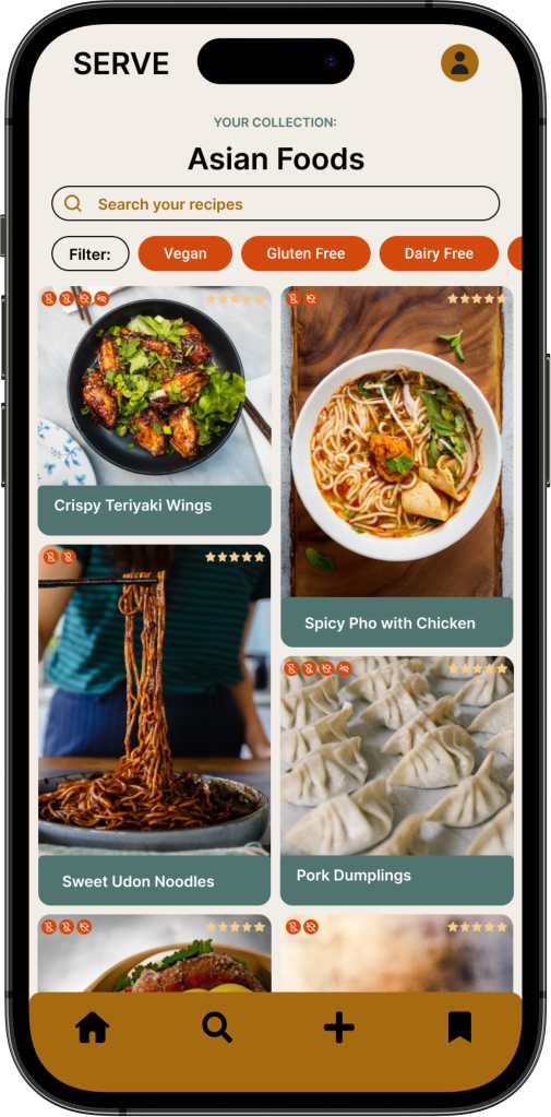A unique opportunity I had with this project was transferring the cultural importance of food and its place in community building into the digital landscape. Allergen icons on each recipe card make it easy for users to identify top allergens in recipes, and a pill button filter system allows quick filtration of search results. Personal profiles allow users to save their favorite recipes into collections of their own organization.