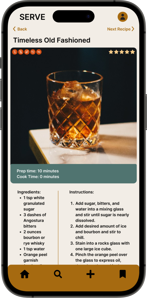 Ever heard the saying “eyes eat first”? I took this philosophy literally for this design and created a visually dominant explore page for users to find inspiration when they aren’t searching for a specific recipe. Once a recipe is clicked, it opens to a full screen view with details and instructions, that also doubles as a secondary way to view recipes by swiping right and left or tapping the arrows at the top of the screen.